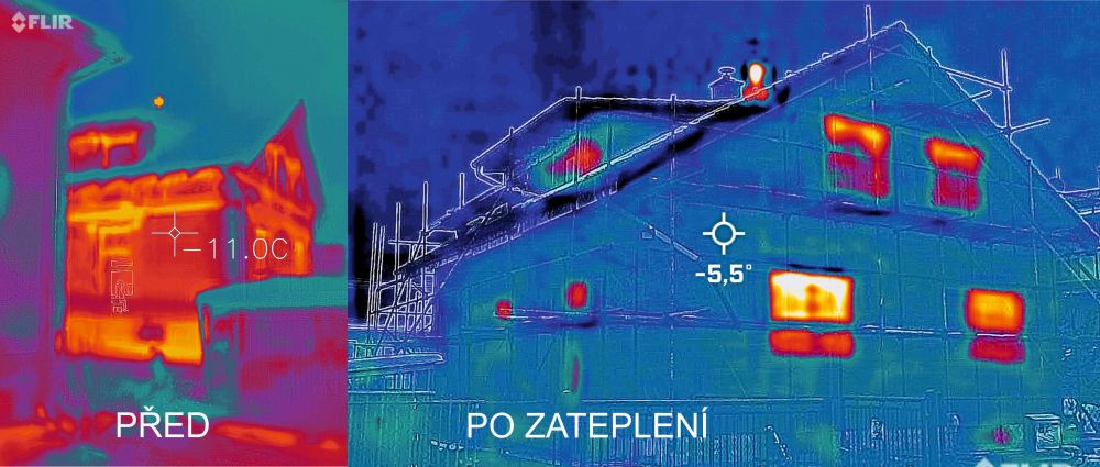 Po zateplení fasády izolací H2Foam Lite se teplota fasády jednoznačně srovnala, což dokazuje jednolitost modré barvy. Finální teplota fasády je blízká vnější teplotě a tepelné úniky jsou patrné jen na místech, kde jsou stavební otvory (okna, dveře), čemuž se vyhnout nedá. Aplikováním stříkané izolace zvýšíte tepelněizolační vlastnosti vašeho domu a snížíte náklady na vytápění.