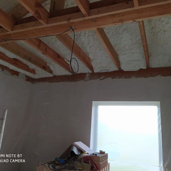 Zateplení rodinného domu v Dobré Vodě u Velkého Meziříčí. Izolace střešní konstrukce izolací ICYNENE H2Foam Lite s kompletní dodávkou a montáží sádrokartonových podhledů Rigips.