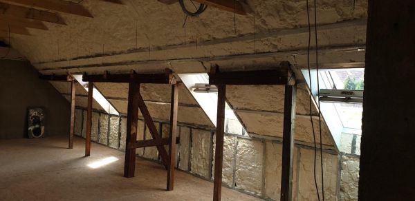 V rámci druhé etapy rekonstrukce domu v Úněšově jsme izolovali podkroví pěnou ICYNENE H2Foam Lite a to do roštu, na který bude následovat sádrokarton. Plocha této etapy realizace činila 140m².